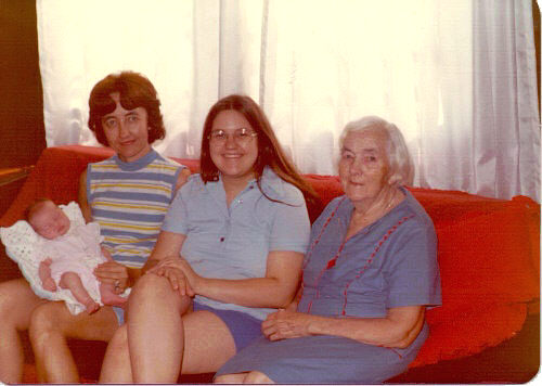 THIS PICTURE WAS TAKEN IN THE SUMMER OF 1979 AT MARYANNE'S MOBILE HOME ON WOLF LAKE, MATTAWAN, MI., JUST AFTER KIM WAS BORN. PICTURED FROM LT. TO RT. ARE KIM, JEANIE, MARYANNE, AND ALICE. ISN'T IT GREAT TO SEE OUR FUTURE GENERATIONS. NOW, KIM IS A NEW MOM WITH A DAUGHTER NAMED KAYLEE.